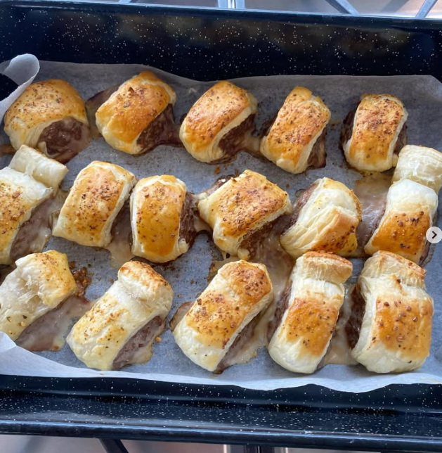 Place half of the beef mince mixture on the short end of the pastry sheet, leaving 1 cm from the edge, then roll up and slice into 8 pieces.